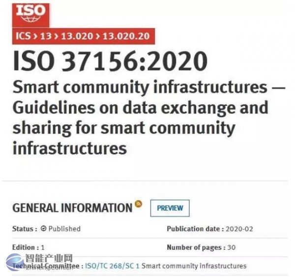 2020年2月12日,国际标准化组织ISO正式发布ISO 37156:2020 Smart community infrastructures——Guidelines on data exchange and sharing for smart community infrastructures《智慧城市基础设施-数据交换与共享指南》,也是ISO在智慧城市领域发布的首个智慧城市基础设施数据标准。